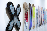 Skateboards (far left - Amanda Topple's first place winning board, “Confinement”) hang on the exhibition walls at the 2024 "All Hands On Deck" competition, part of the Lynn University NFT Art Museum Exhibit and Discussion Panel on Oct. 16, 2024, held at the Lynn University NFT Museum at the Boca Raton Innovation Campus (BRiC) in Boca Raton.