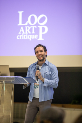 Mic in hand, Brandon Novak, author and professional skateboarder, speaks at the "All Hands On Deck" skateboard deck competition portion of the NFT Art Museum Exhibit and Discussion Panel on Oct. 16, 2024.