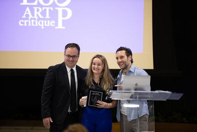 Dr. Cesar Santalo, Dean of the College of Communication and Design, and Brandon Novak, professional skateboarder, pose with a student at the NFT Art Museum Exhibit and Discussion Panel on Oct. 16, 2024.