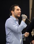 Mic in hand, Brandon Novak, author and professional skateboarder, speaks at the All Hands On Deck skateboard deck competition portion of the NFT Art Museum Exhibit event and Discussion Panel on Oct. 16, 2024.