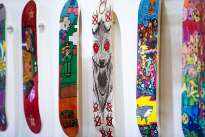 Skateboards hang on the exhibition walls at the 2024 "All Hands On Deck" competition, part of the Lynn University NFT Art Museum Exhibit and Discussion Panel on Oct. 16, 2024, held at the Lynn University NFT Museum at the Boca Raton Innovation Campus (BRiC) in Boca Raton.