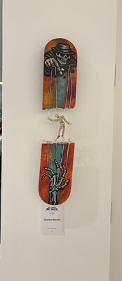 The winner of the "Shred the Norm Award" - a puppet-themed skateboard designed by Lynn Student Giuliana Barioli hangs on an exhibition wall at the 2025 "All Hands On Deck" competition.