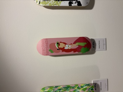 A Strawberry Shortcake-themed skateboard hangs on an exhibition wall at the 2025 "All Hands On Deck" competition, part of the Lynn University NFT Art Museum Exhibit and Discussion Panel on Oct. 28, 2025, held at the Lynn University NFT Museum at the Boca Raton Innovation Campus (BRiC) in Boca Raton.