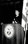 Black and white image of Maureen Reagan, best-selling author and the daughter of President Ronald Reagan, delivers the Commencement speech at the College of Boca Raton Commencement Ceremony on May 4, 1991.