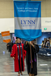 The College of Education Gonfalon Bearer Dr. Kelly Burlison, Associate Professor, Reading and ESOL, and Marshall Dr. Jennifer Lesh, Associate Professor, Exceptional Student Education, during the 2025 Lynn University Commencement faculty processional.