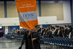The College of Aeronautics Gonfalon Bearer Frank Ferrante, Assistant Professor, and Marshall Don Koorse, Assistant Professor, during the 2025 Lynn University Commencement faculty processional.