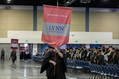 Conservatory of Music Gonfalon Bearer Dan Satterwhite, Professor - Trombone, and Marshall Lisa Leonard, Professor - instrumental collaborative piano, during the 2025 Lynn University Commencement faculty processional.