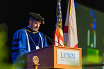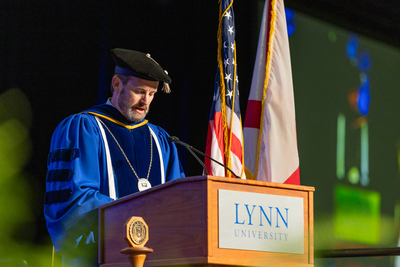 Lynn University President Dr. Kevin Ross speaks at the podium during the 2025 Lynn University Commencement ceremony.