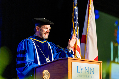 Lynn University President Dr. Kevin Ross speaks at the podium during the 2025 Lynn University Commencement ceremony.
