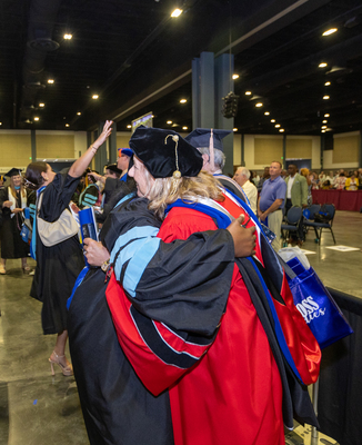 Dr. Jennifer Lesh, Associate Professor, Exceptional Student Education in the College of Education, hugs a newly graduated doctoral student.