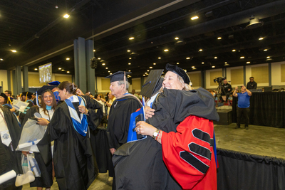 Dr. Jennifer Lesh, Associate Professor, Exceptional Student Education in the College of Education, hugs a newly graduated doctoral student.