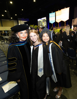2025 Lynn University graduates pose for a photo with Board of Trustees Chair Christine E. Lynn following the commencement ceremony.