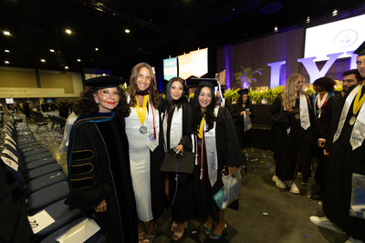 2025 Lynn University graduates pose for a photo with Board of Trustees Chair Christine E. Lynn following the commencement ceremony.
