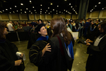 Dr. Karima Lanfranco, Assistant Professor of Hospitality in the College of Business and Management, speaks to a 2025 Lynn University graduate following the commencement ceremony.