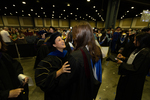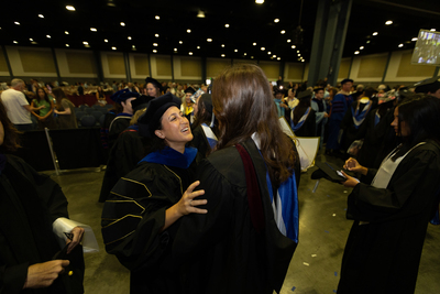 Dr. Karima Lanfranco, Assistant Professor of Hospitality in the College of Business and Management, speaks to a 2025 Lynn University graduate following the commencement ceremony.