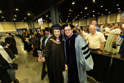 Dr. Christopher Zapalski, Assistant Dean, College of Business and Management, poses for a photo with a 2025 Lynn University graduate following the commencement ceremony.