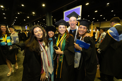 2025 Lynn University graduate McKenzie McFarland celebrates commencement with the College of Communication and Design Associate Dean Dr. Stefanie Powers, Professor Gary Carlin, and her mom Assistant Professor Jennifer McFarland.