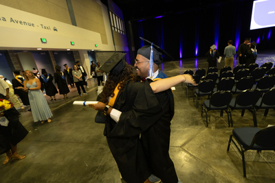 2025 Lynn University graduates embrace following the commencement ceremony.