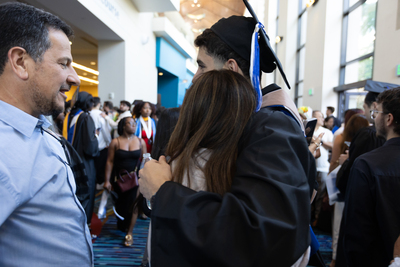 2025 Lynn University graduates embrace following the commencement ceremony.
