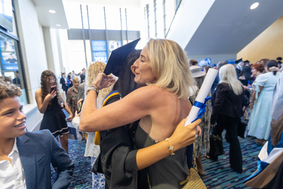 A 2025 Lynn University graduate embraces a loved one following the commencement ceremony at the Palm Beach Convention Center.