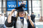 A 2025 Lynn University graduate adjusts her tassel at the Palm Beach Convention Center.