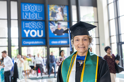 A 2025 Lynn University graduate poses for a photo at the Palm Beach Convention Center.