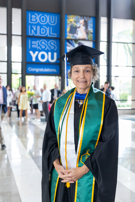 A 2025 Lynn University graduate poses for a photo at the Palm Beach Convention Center.