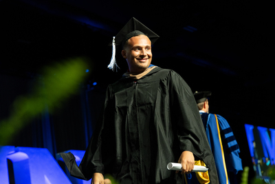 A 2025 Lynn University graduate crosses the stage during the commencement ceremony.