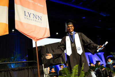 A 2025 Lynn University graduate crosses the stage during the commencement ceremony.