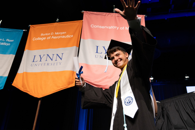 A 2025 Lynn University graduate crosses the stage during the commencement ceremony.