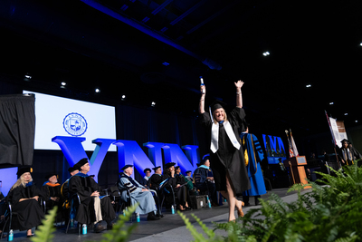 A 2025 Lynn University graduate crosses the stage during the commencement ceremony.
