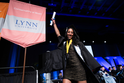 A 2025 Lynn University graduate crosses the stage during the commencement ceremony.