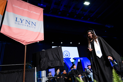 A 2025 Lynn University graduate crosses the stage during the commencement ceremony.