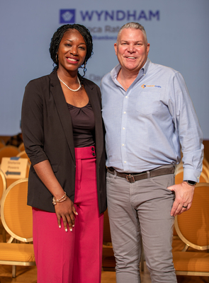 Rob Scheer, founder of Comfort Cases, and Dr. Jessica Pryce—keynote speaker, spoke in the Wold theater.