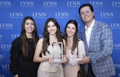 Isabella Pereira dos Santos, recipient of The Dean’s Award for Excellence in Undergraduate Education - College of Business and Management, poses with her loved ones and her award.