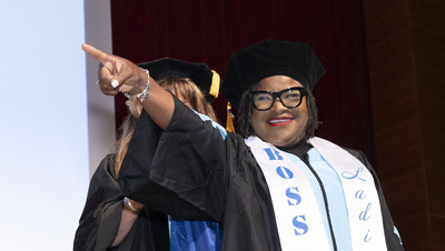 Noble Lockhart-Mays, Lynn doctoral candidate points at someone in the crowd before being hooded by Dr. Kathleen Weigel, Dean of the College of Education, at the 2025 Knight of Honor Awards and hooding ceremony.