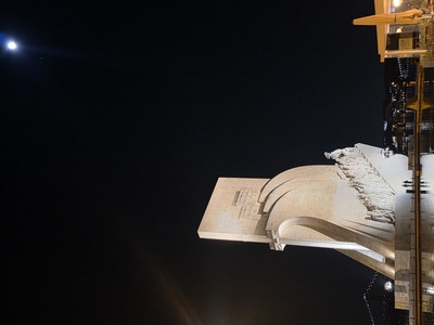 (night shot) The Monument to the Discoveries (Padrão dos Descobrimentos), which commemorates the Portuguese Age of Discovery, is located on the Tagus River in the Belém district in Lisbon, Portugal, in October 2025.