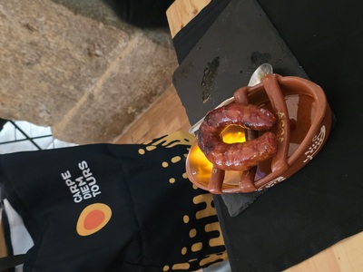 A traditional Portuguese dish called chouriço or linguiça assado, which is a type of sausage cooked in a small, boat-shaped terracotta dish over an open flame.