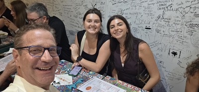 College of Aeronautics Dean David Cohen, Employer Relations Manager Samantha Gallo, and Study Abroad Advisor Caroline Martins at a restaurant in Lisbon, Portugal during their study abroad trip in October 2025.