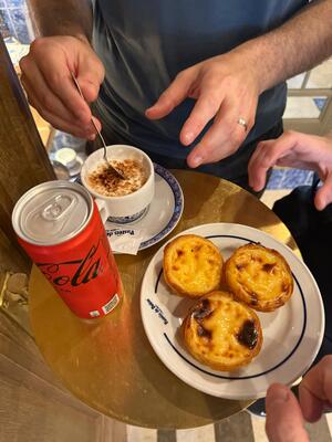 Portuguese custard tarts, known as pastel de nata, and coffee