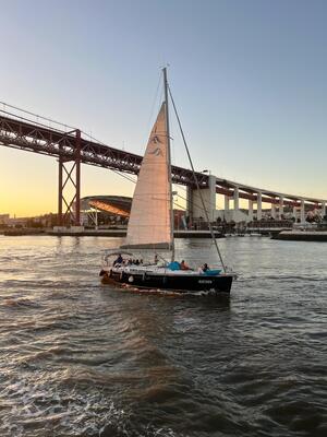 A sailboat on the Tejo River and the 25 de Abril Bridge, a suspension bridge in Lisbon, Portugal in October 2025.