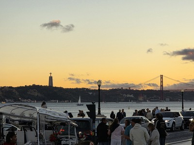 Panoramic view of the Tejo River and the 25 de Abril Bridge, a suspension bridge in Lisbon, Portugal in October 2025.