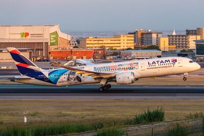 A Latam airplane on the runway in Lisbon, Portugal in October 2025.