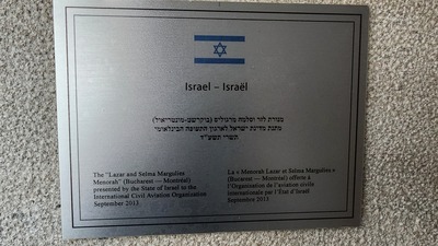 (sign) The "Lazar and Selma Margulies Menorah" (Bucharest - Montreal) presented by the State of Israel to the International Civil Aviation Organization September 2013.